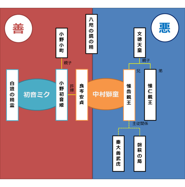 歌舞伎ファンにはおなじみにの顔見世舞踊『積恋雪関扉(つもるこいゆきのせきのと)』に着想を得た演目で、主演の2人は共に一人二役に挑戦する。中村獅童は超歌舞伎で初の悪人役の惟喬親王(これたかしんのう)と、これに敵対する良岑安貞(よしみねやすさだ)の2人を演じ分ける。初音ミクは安貞の許嫁である小野初音(おののはつね)と白鷺の精霊の2役を演じ分ける。