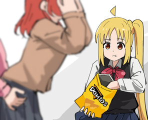 「学校の制服を着た高校生くらいの男女3名が映っている。そのうち男女2名は向かって左側で性行為の真似事をしている。向かって右側では女性1名が真顔で床に座ってその光景を見つめつつ、ポテトチップスの袋に手を突っ込んでいる」という写真。言わずもがなだが、被写体3名のうち「ポテチ姉貴」と呼ばれているのは向かって右側でポテトチップスを食っている女性である。